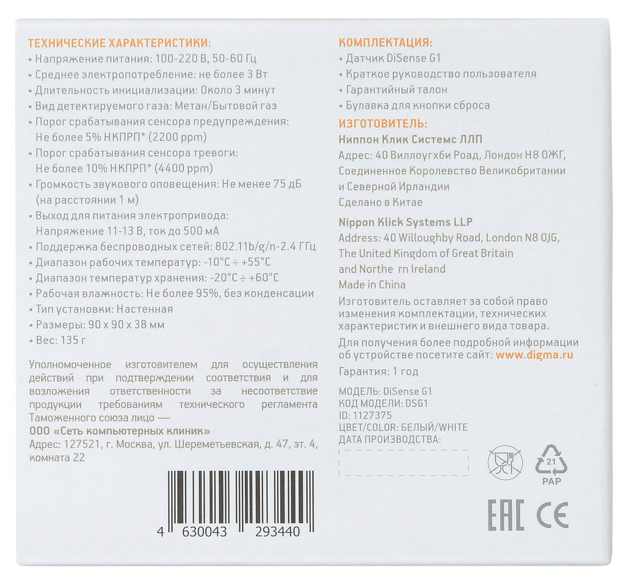 Комплект поставки Датчик DiSense G1, руководство пользователя, гарантийный талон, булавка для кнопки сброса.
