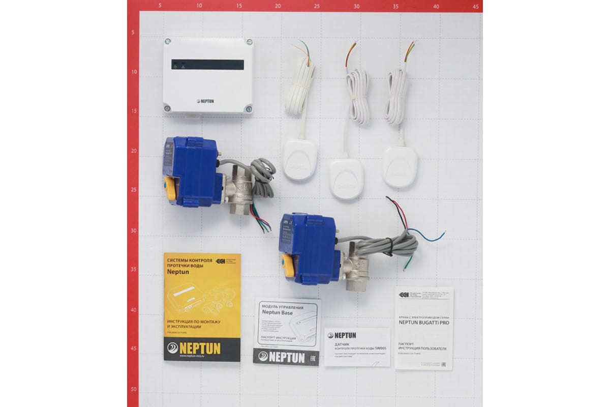 Система контроля протечки воды Neptun Base 1/2 включает в себя устройства для своевременной фиксации и блокировки протечек воды. Подходит для систем водоснабжения и отопления. В случае возникновения аварийной ситуации модуль управления Neptun Base отправляет управляющий сигнал на шаровый кран с электроприводом, который блокирует подачу воды. Система оповещает пользователя об аварийной ситуации световым и звуковым сигналами. Монтаж модуля осуществляется накладным способом.