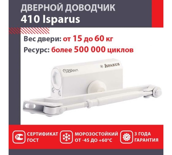 Дверной доводчик ISPARUS 410 белый 17196 служит для плавного закрывания дверей и калиток весом от 15 до 60 кг. Универсальный, морозостойкий, работает при температурах от -45 до +60 градусов.
