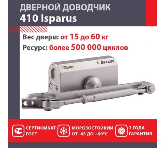 Дверной доводчик ISPARUS 410 серебро 17199 служит для плавного закрывания дверей и калиток весом от 15 до 60 кг. Универсальный, морозостойкий, работает при температурах от -45 до +60 градусов.
