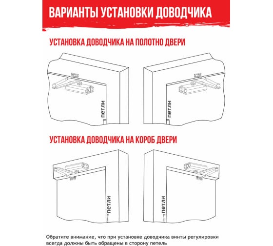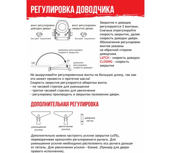 Скорость закрывания и скорость доводки двери регулируются независимо, при установке.