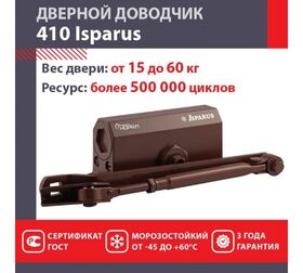Дверной доводчик ISPARUS 410 коричневый 17200 служит для плавного закрывания дверей и калиток весом от 15 до 60 кг. Универсальный, морозостойкий, работает при температурах от -45 до +60 градусов.