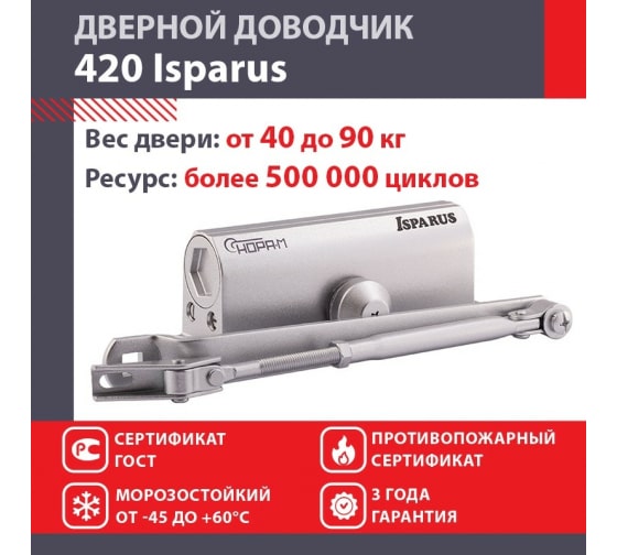 Дверной доводчик НОРА-М Isparus 420 морозостойкий, для дверей от 40 до 90 кг, серебро 18721 имеет класс EN2-4.