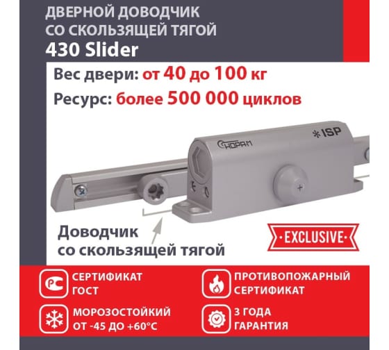Дверной доводчик НОРА-М Isparus 430 Slider скользящая тяга, для дверей до 110 кг, серый 18777 - морозостойкий дверной доводчик со скользящей тягой для дверей весом от 40 до 110 кг. с широким диапазоном рабочей температуры от -45 до +60 градусов по Цельсию.