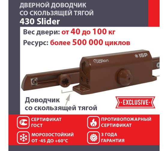 Дверной доводчик НОРА-М Isparus 430 Slider скользящая тяга, для дверей до 110 кг, коричневый 18778 - морозостойкий дверной доводчик со скользящей тягой для дверей весом от 40 до 110 кг. с широким диапазоном рабочей температуры от -45 до +60 градусов по Цельсию.