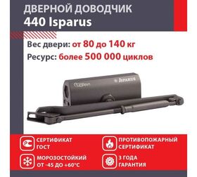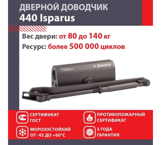 Дверной доводчик ISPARUS 440 морозостойкий, графит 17203 служит для плавного закрывания дверей и калиток весом от 80 до 140 кг. Универсальный, морозостойкий, работает при температурах от -45 до +60 градусов.
