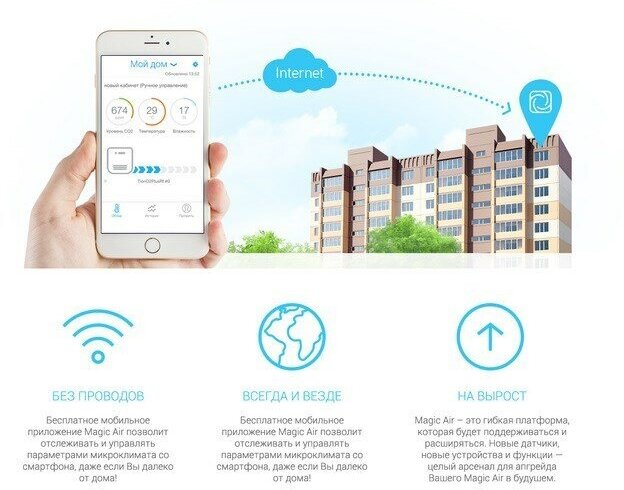Управление приборами и параметрами микроклимата возможно как в ручном, так и в полностью автоматическом режиме из приложения MagicAir на смартфоне (операционная система Android 4.4 и выше и iOS 11.0 и выше). Например, когда в помещении становится душно и превышен заданный уровень CO2, MagicAir автоматически включит бризер на проветривание.