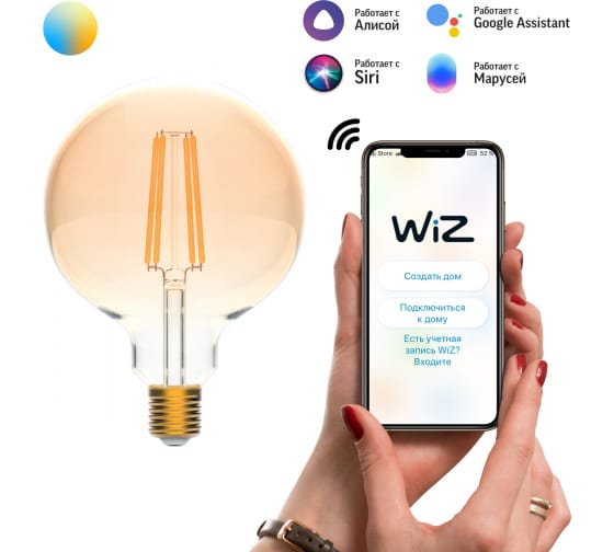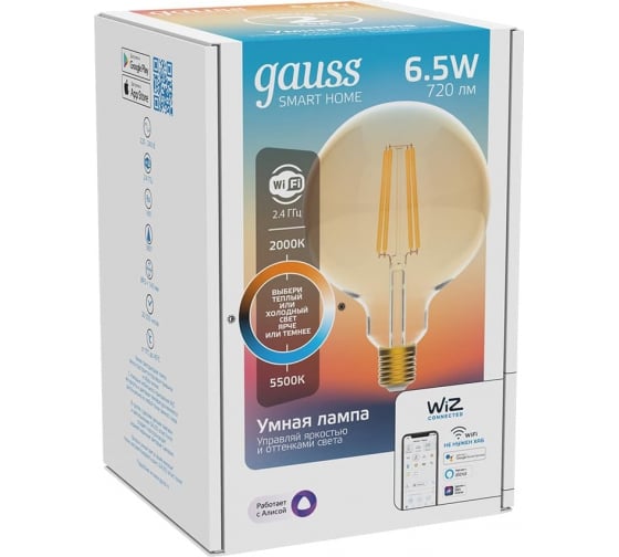 Умная Wi-fi филаментная лампочка Gauss, Smart Light ССТ DIM E27 G95 6,5 Вт 2700-6500K 1340112: