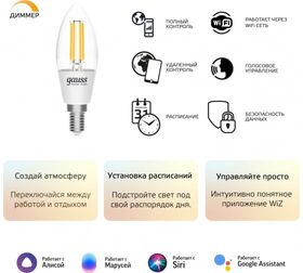 Умная Wi-fi филаментная лампочка Gauss, Smart Light DIM E14 C35 4,5 Вт 2700-6500K, диммируемая, управление голосом/смартфоном 1230112: