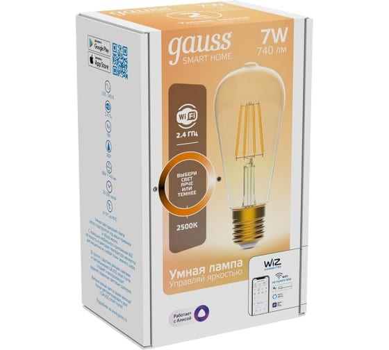 Умная Wi-fi филаментная лампочка Gauss, Smart Light DIM E27 ST64 7 Вт 2700-6500K, диммируемая, управление голосом/смартфоном 1290112: