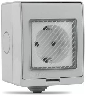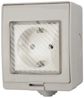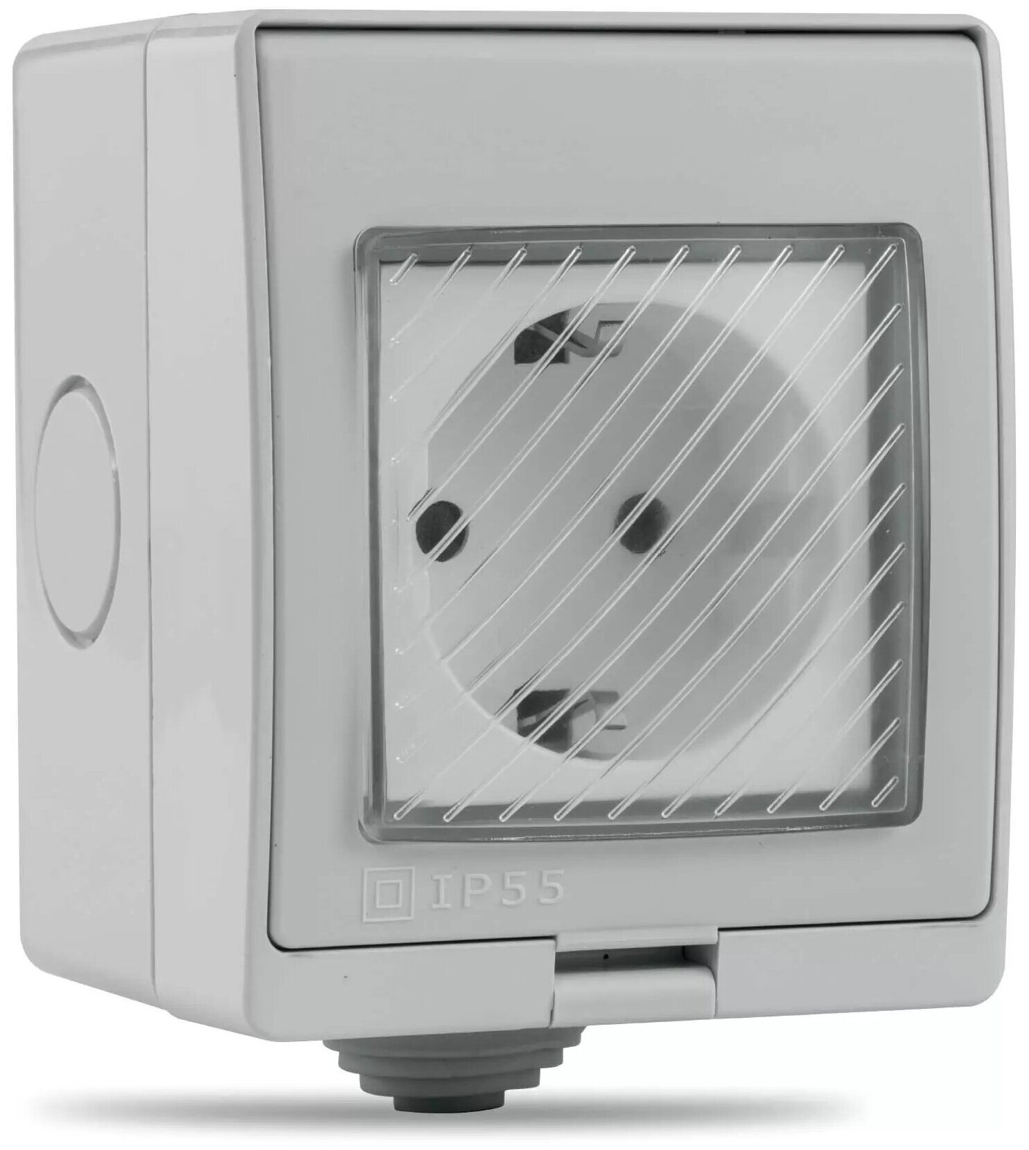 Благодаря степени защиты IP55 розетка не боится влаги и подходит для установки в сырых помещениях и на улице.