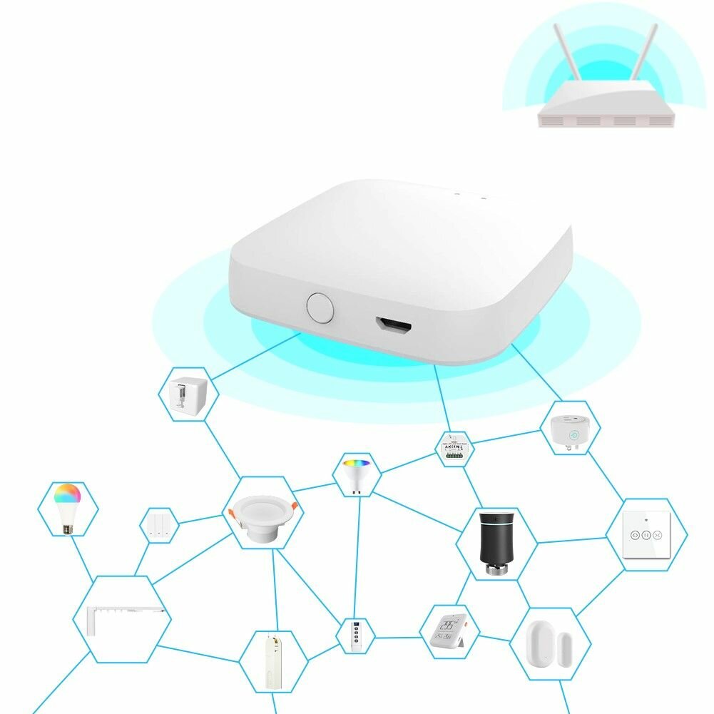 Блок управления умным домом Moes MHUB-W , белый, обладает массой 60 г. Габариты устройства составляют 15х60х60 мм. Длина комплектного шнура питания — 50 см. Корпус квадратной формы выполнен из пластика. Предусмотрена возможность обновления встроенного ПО. На лицевой стороне размещается индикатор включения. К модели можно одновременно подключать до 50 беспроводных устройств. Модель предназначена для эксплуатации внутри сухого помещения. Для управления устройством можно использовать смартфон.