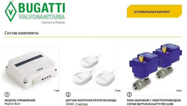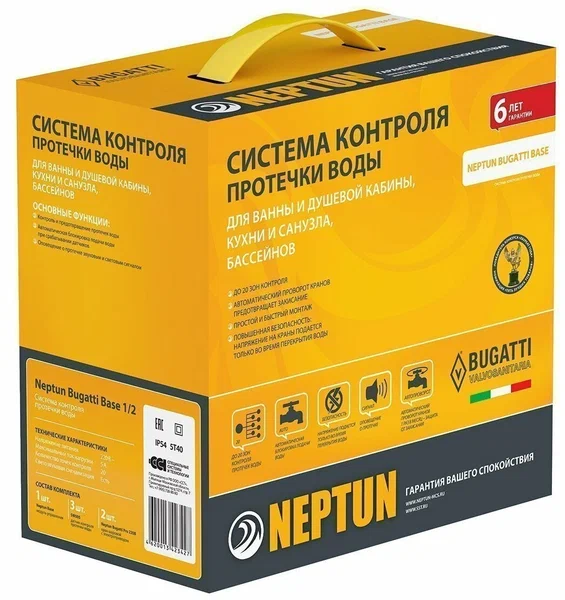 Система контроля протечки воды Neptun Bugatti Base 1/2 дюйма предназначена для своевременного обнаружения и локализации протечек воды в системе водоснабжения и отопления жилых домов, коттеджей, офисных зданий, магазинов. Система заблокирует подачу воды до устранения причин протечки и проинформирует о возникшей аварии звуковым и световым сигналами.