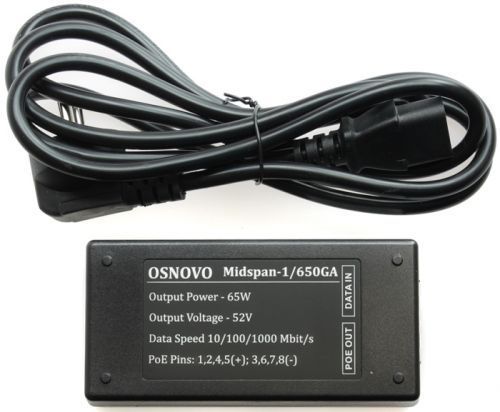 PoE-инжектор Gigabit Ethernet на 1 порт, мощностью до 65W. Мощность PoE на порт - до 65W. Напряжение PoE - 52V(конт. 1,2,4,5(+), 3,6,7,8(-)). Порты: вх. - 1 x RJ45(10/100/1000 Base-T), вых. 1 x RJ45(10/100/1000 Base-T, PoE 52V). Встроенная грозозащита 3kV. Питание: AC100-240V.