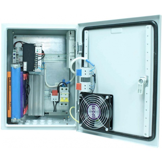 Уличная станция с термостабилизацией, резервным питанием и оптическим кроссом. Промышленный БП DC48V(240W), АКБ 48В(2Ач). Защита АКБ от глубокого разряда. В основе металлический шкаф с классом защиты IP66. Доступное место под установку оборудования на встроенные DIN-рейки: верхняя - 80мм. Может поставляться со встроенным оборудованием по заказу. Размеры (ШхВхГ): 300x400x210мм. Рабочая температура (температура окружающей среды): -40…+50°С, температура внутри станции -7…+50°С.