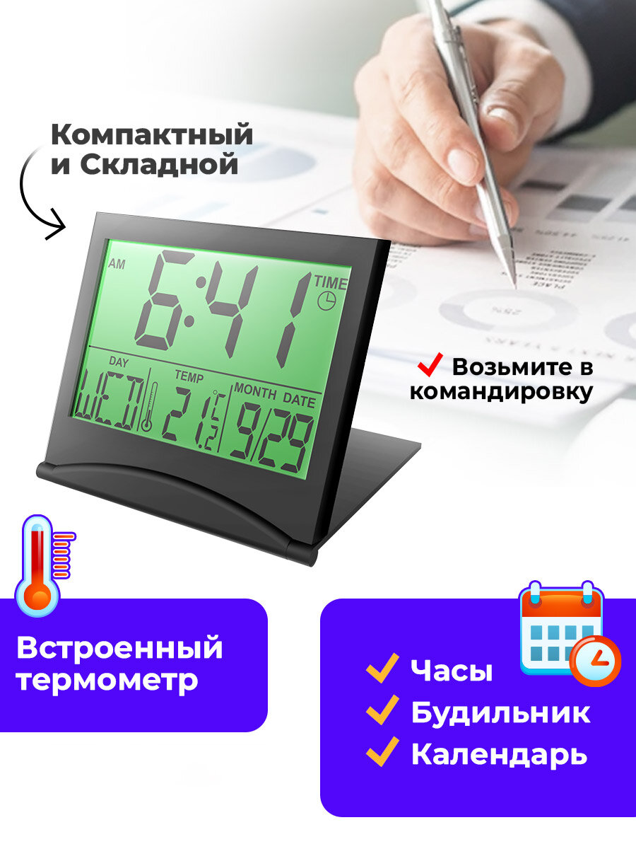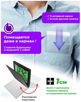 Модель часов с будильником Ritmix CAT-042 отличается компактным дизайном, чрезвычайно удобным как для дома, так и для путешествий. Складной корпус, толщина которого в сложенном виде составляет 1 см, позволяет брать часы с собой куда угодно, при этом, не занимая много места.