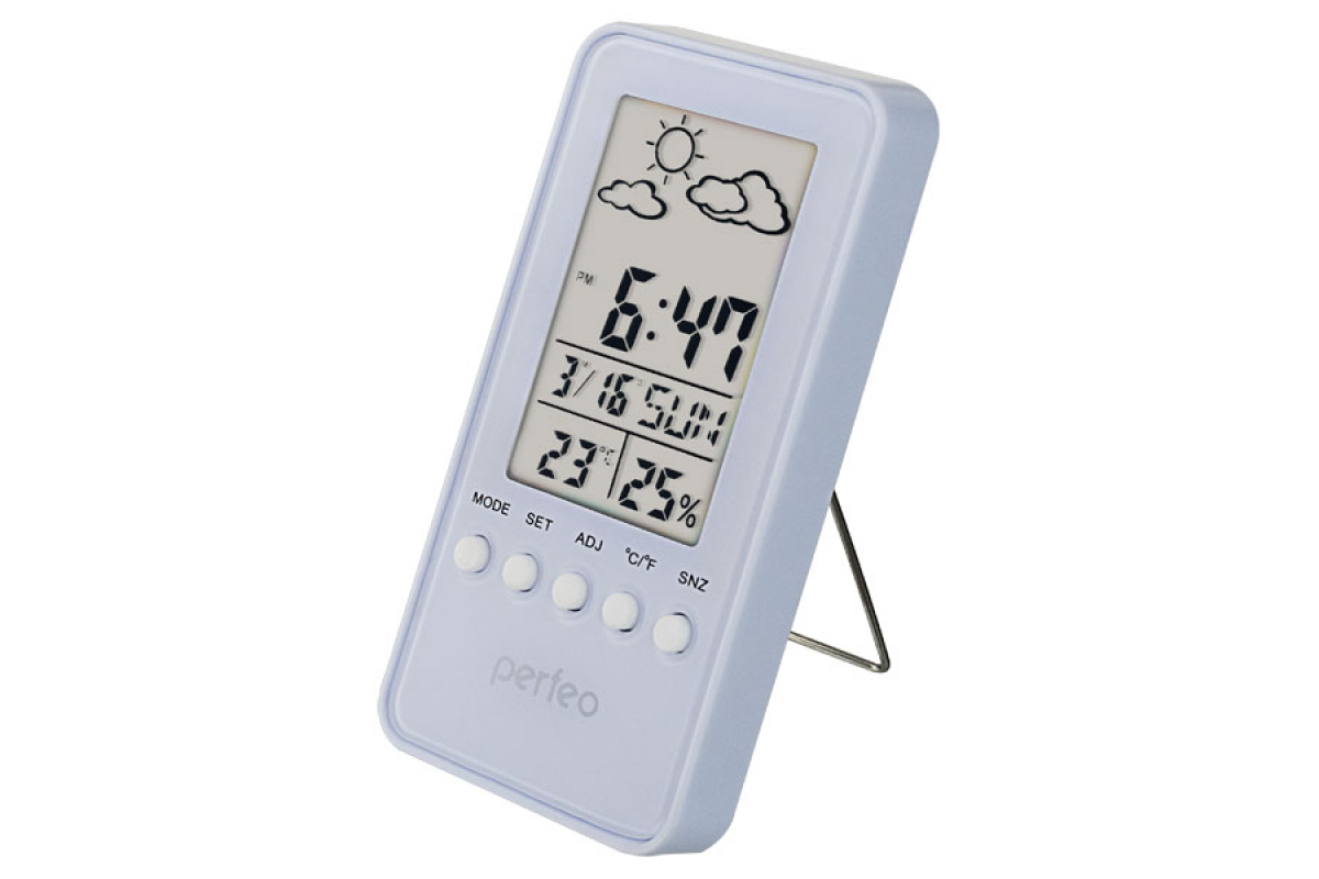 Часы-метеостанция PERFEO Window PF-S002A белый измеряют относительную влажность воздуха и температуру, отображает время и дату. Также предусмотрен встроенный будильник с функцией поворота.