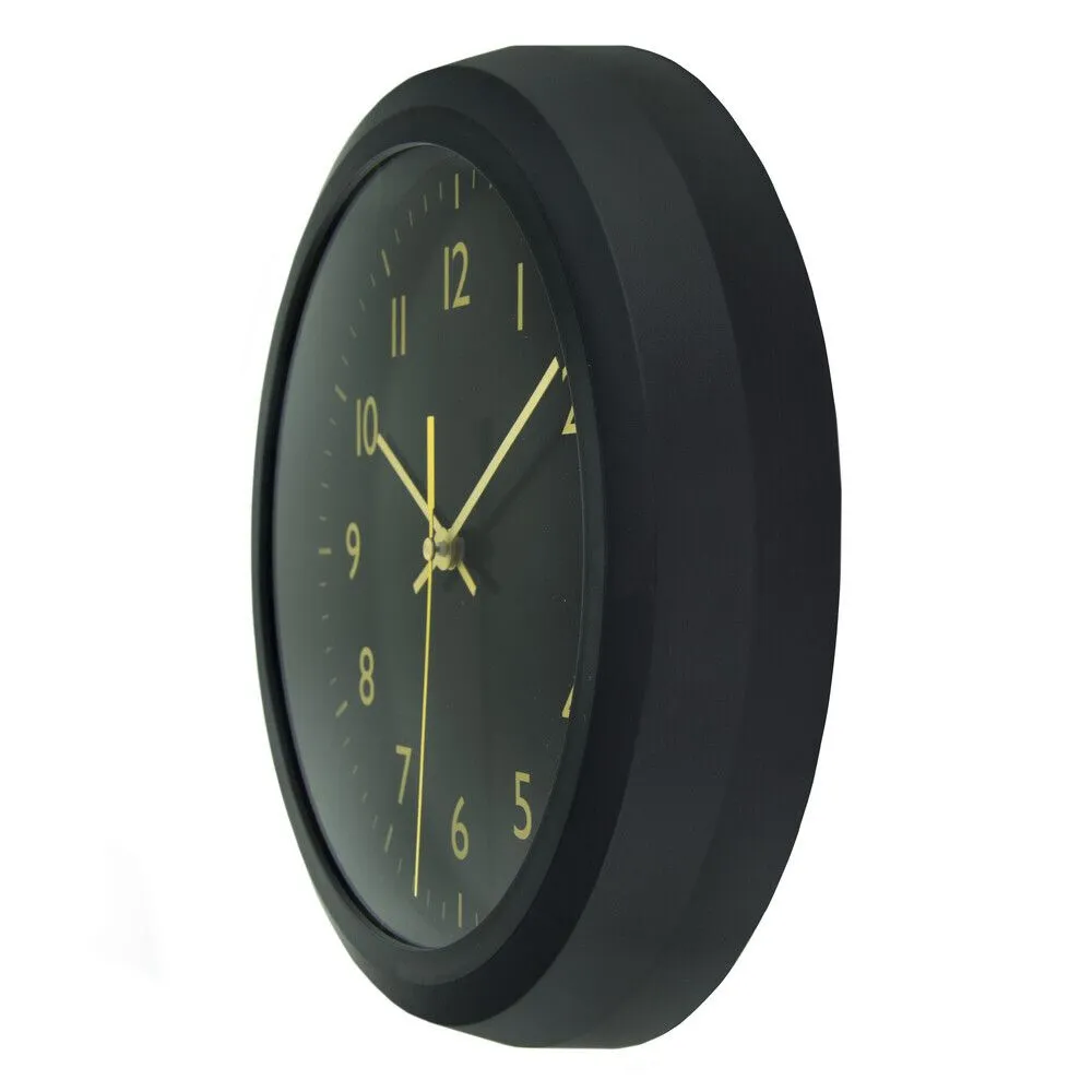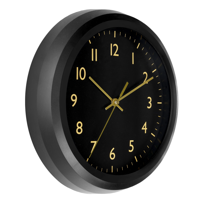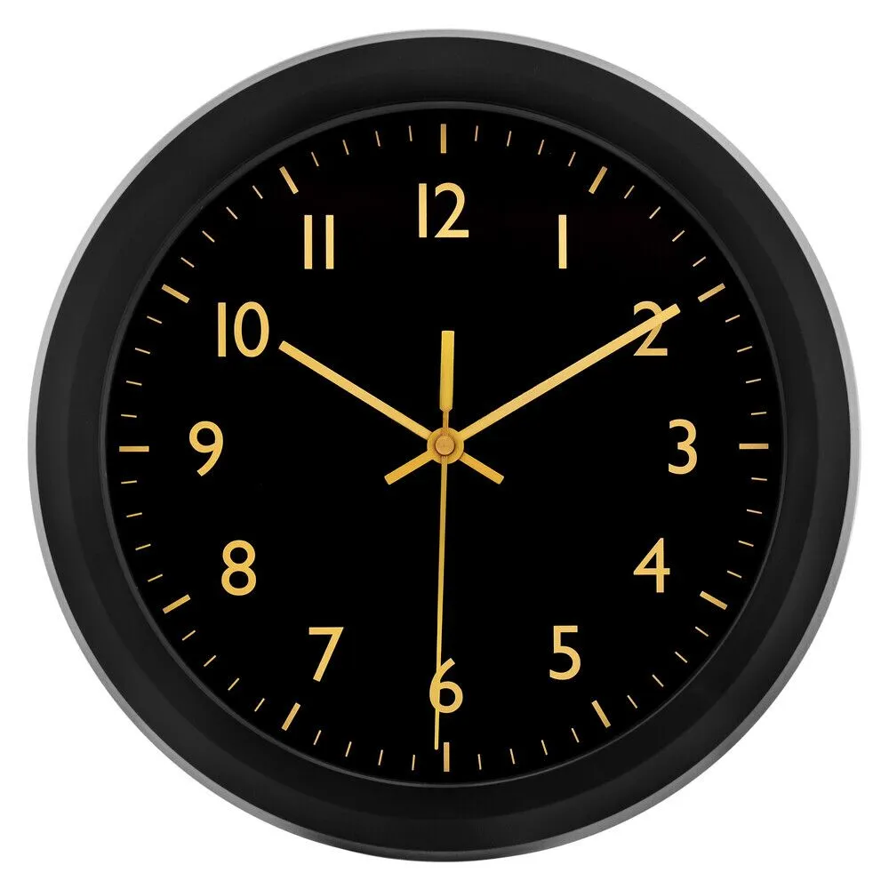 Эти круглые часы имеют черный корпус и черный циферблат с арабскими цифрами, что делает их элегантным дополнением любого помещения. Материал корпуса - пластик, что делает их легкими и прочными.