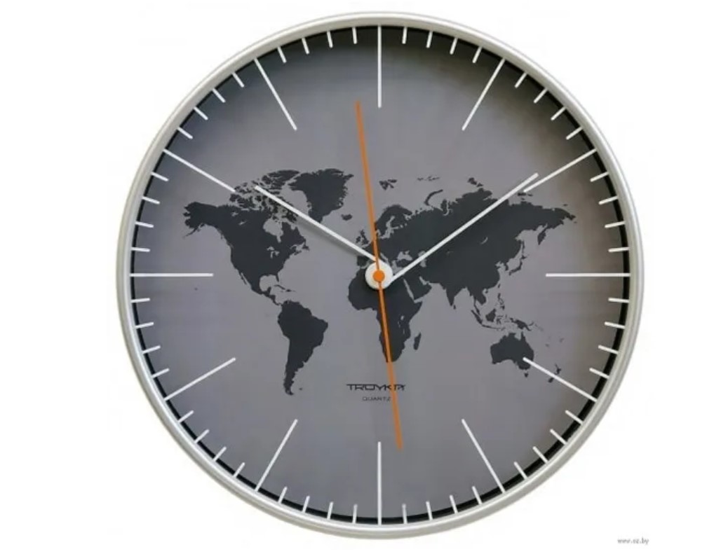 Настенные кварцевые часы в круглом пластиковом корпусе. Белорусская часовая компания «Тройка» предлагает широкий выбор качественных настенных часов оригинального дизайна, разнообразных форм и расцветок, часов с тематической символикой и по приятным ценам. Кварцевые настенные часы «Тройка» - это идеальный выбор для тех, кто ценит надежные и интересные вещи. Круглый корпус из пластика. Циферблат украшен изображением материков. Штриховые метки. Три стрелки. Яркая секундная стрелка.