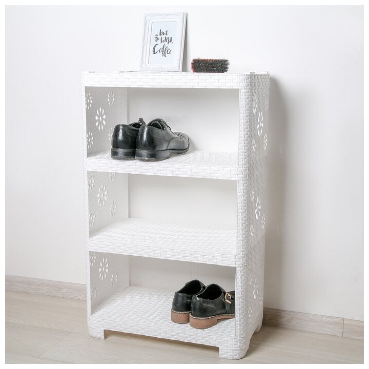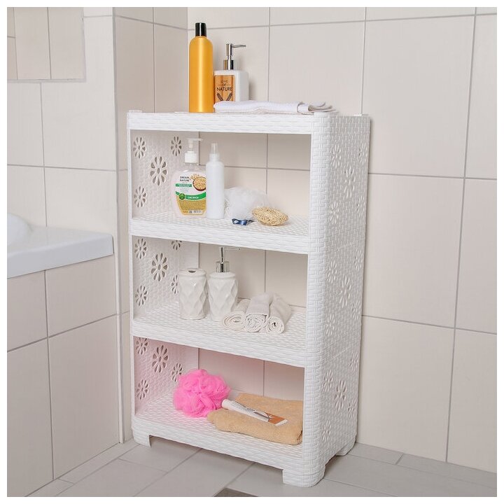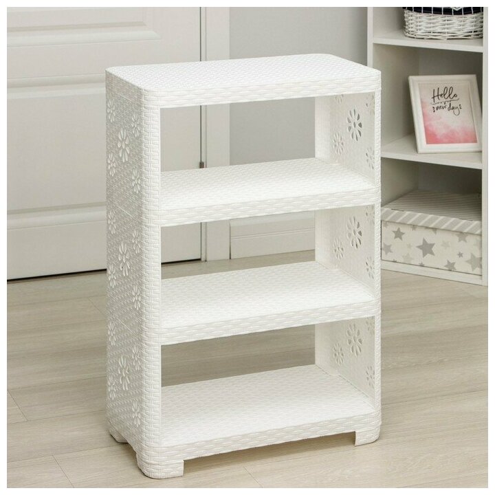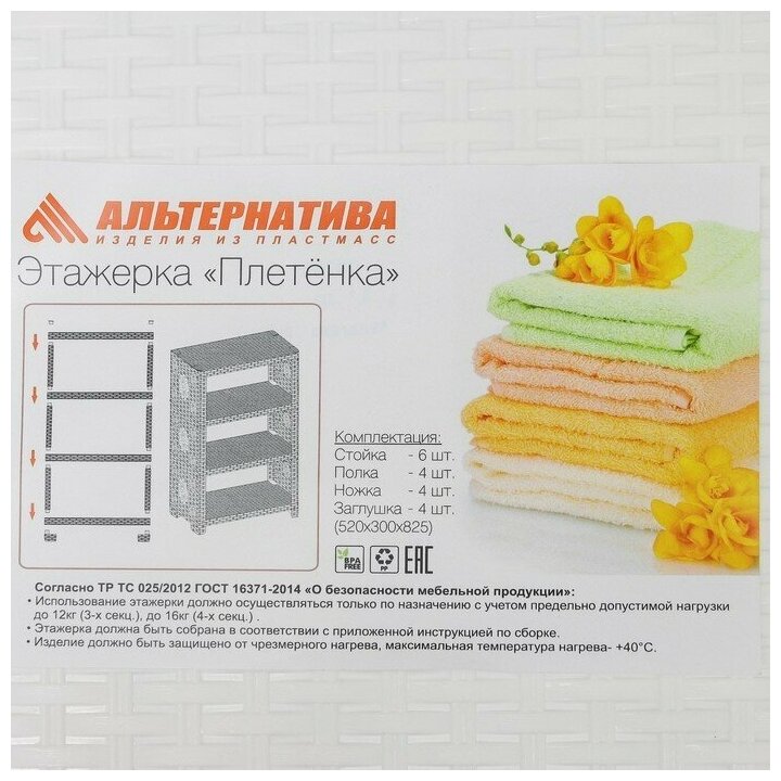 Этажерка «Плетенка» обеспечит дополнительное место для хранения необходимых предметов. Этажерка имеет две стенки и четыре полки. Такая этажерка впишется в любой интерьер и будет удобна при использовании на кухне, в ванной и прихожей. Оригинальный внешний вид задает поверхность конструкции в виде плетения и представленные цветовые решения. Этажерка очень легко передвигается, за счет своего легкого веса и не занимает много места. Этажерка легко собирается, упаковывается в индивидуальную упаковку и прилагается инструкция по сборке.