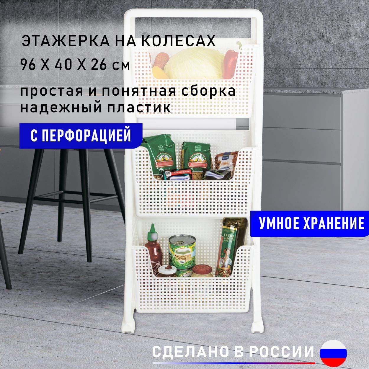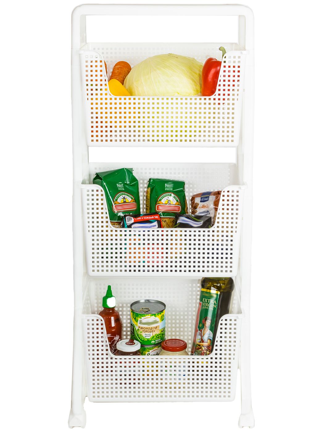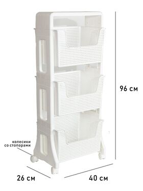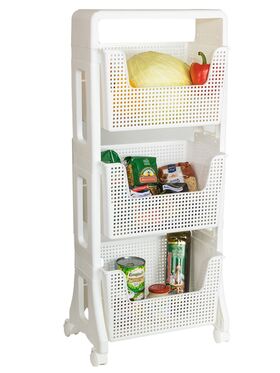 Практичная и многофункциональная универсальная 3-х ярусная пластиковая этажерка на колесиках с перфорацией SupraКeeping для кухни, ванной, прихожей, спальни или другого помещении - это нестандартное решение для экономии места и компактного хранения принадлежностей. На кухне напольный органайзер на колесиках отлично подойдет для хранения овощей, фруктов и различной кухонной утвари. В детской комнате для хранения игрушек, книг, тетрадей или канцелярских товаров. В гостиной этажерку можно использовать в качестве полки для хранения книг, журналов или рукоделия. В прихожей передвижная полка пригодится для компактного хранения обуви, домашних тапочек, шапок, перчаток, шарфов, зонтов и различных мелочей. При использовании в ванной комнате в напольном органайзере удобно размещаются средства гигиены, косметики, банных принадлежности и полотенец. Благодаря лаконичному дизайну и цвету, этажерку - органайзер можно использовать не только дома, но и в салонах красоты, парикмахерских, массажных и косметологических кабинетах, а так же в медицинских центрах. Универсальная полка с перфорацией выполнена из качественного пластика, имеет 3 глубоких полки-лотка. Свободное перемещение обеспечивают колесики со стопором.