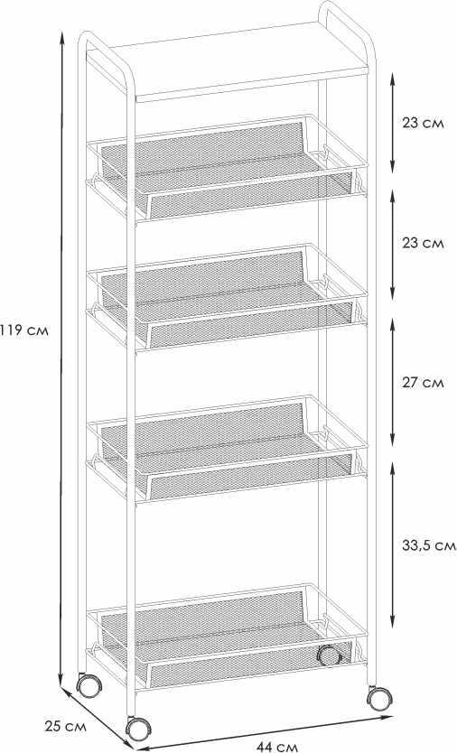 Функциональный напольный стеллаж Ладья 25КС от российского производителя ЗМИ - идеальный органайзер для вашего дома, дачи, квартиры и офиса. Эта стильная, прочная модель отлично подходит для организации места на кухне, в ванной комнате, гостиной или любой другой части вашего дома. Она идеальна для хранения книг и бумаг на работе. Если вам необходимо дополнительное место для нужных в повседневной жизни предметов или просто хотите сэкономить пространство, этот компактный органайзер подойдет идеально! Он изготовлен из металла и представлен в различных цветах, чтобы соответствовать стилю вашего помещения. Среди предложенного в нашем магазине ассортимента можно выбрать модели серого, черного, белого, коричневого и графитового цвета. Такая тележка, оснащенная колесиками и корзинами с бортиками будет превосходно смотреться в ванной у раковины и любом другом помещении. Например, на кухне, балконе, лоджии, в спальне, гостиной, коридоре, прихожей, детской комнате. Ей найдется применение даже в салоне красоты, парикмахерской, студии, рабочем кабинете мастера косметолога, бане. Изделие с металлическим каркасом и сетчатыми корзиночками покрыта полимерной краской. За счет этого она надолго сохранит красивый первозданный вид. Органайзер обладает компактными размерами, небольшой шириной и легко помещается даже в ограниченном пространстве. На четырех широких корзинах, которые выдерживают вес до 10 кг каждая, легко поместятся кухонные принадлежности, специи, овощи и фрукты. В ванной и туалете передвижной стеллаж можно использовать для бытовой химии, расчесок, моющих туалетных и косметических средств. Также изделие подойдет для цветочных горшков, книг, игрушек ребенка. Верхняя металлическая полочка - столик делает данную сборную конструкцию максимально функциональной. В комплекте прилагается дополнительный аксессуар в виде пластикового крючка. Товар поставляется в разобранном виде в картонной упаковке, на которой предусмотрена удобная ручка. За счет этого вы легко сможете донести покупку от пункта выдачи до дома или машины, а так-же вручить в качестве подарка на день рождения, новоселье и по любому другому поводу. Сборка осуществляется невероятно легко по схеме сборки. Чтобы собрать этажерку, даже не потребуются инструменты.