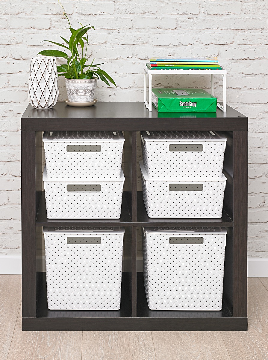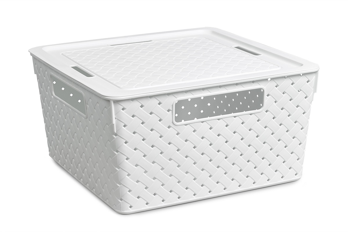 Емкость из пищевого пластика для хранения и переноски мелких аксессуаров и продуктов питания. В объеме 11л корзинки оптимальны для хранения одежды и обуви, овощей и корнеплодов, книг и игрушек и пр. Изделие имеет ручки с четырех сторон, что удобно для использования и переноски. Бортик по периметру крышек обеспечивает фиксацию при штабелировании корзинок друг на друга. Узор «Береста» по всему корпусу придает корзинкам натуральный вид и делает их легкими и проветриваемыми.