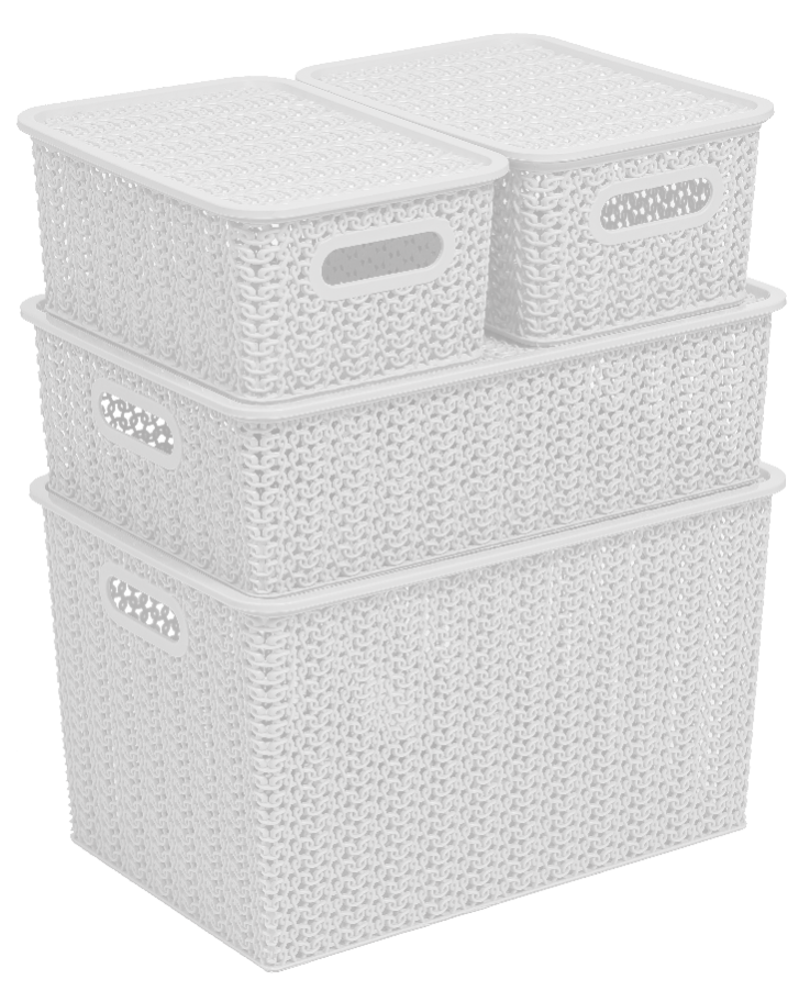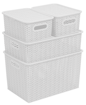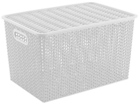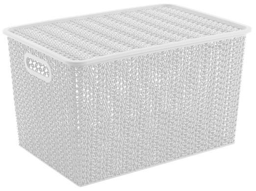 Емкость из пищевого пластика для хранения и переноски мелких аксессуаров и продуктов питания. В объеме 14л корзинки оптимальны для хранения одежды и обуви, овощей, книг и игрушек и пр. С врезными ручками обтекаемой формы корзинки удобно перемещать. Бортик по периметру крышек обеспечивает фиксацию при штабелировании корзинок друг на друга. Узор «Вязь» по всему корпусу и крышке придает корзинкам натуральный вид и делает их легкими и проветриваемыми.
