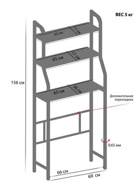 Комплектация: узкая полка (65х17 см) - 2 шт., широкая полка (65х26 см) - 1 шт., перекладина для крепления полок - 6 шт., опора (верхняя часть) - 2 шт., опора (нижняя часть) - 2 шт., перекладина Н-образная - 1 шт., крепеж - 16 шт.