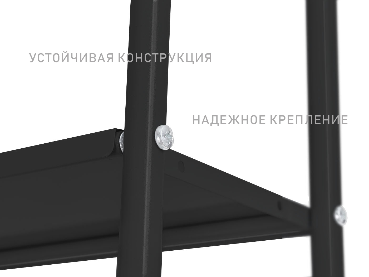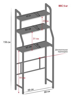 Комплектация: узкая полка (65х17 см) - 2 шт., широкая полка (65х26 см) - 1 шт., перекладина для крепления полок - 6 шт., опора (верхняя часть) - 2 шт., опора (нижняя часть) - 2 шт., перекладина Н-образная - 1 шт., крепеж - 16 шт.