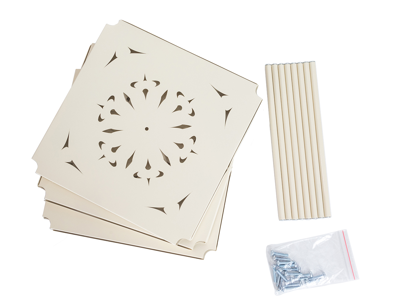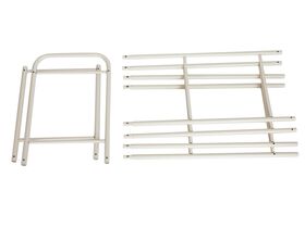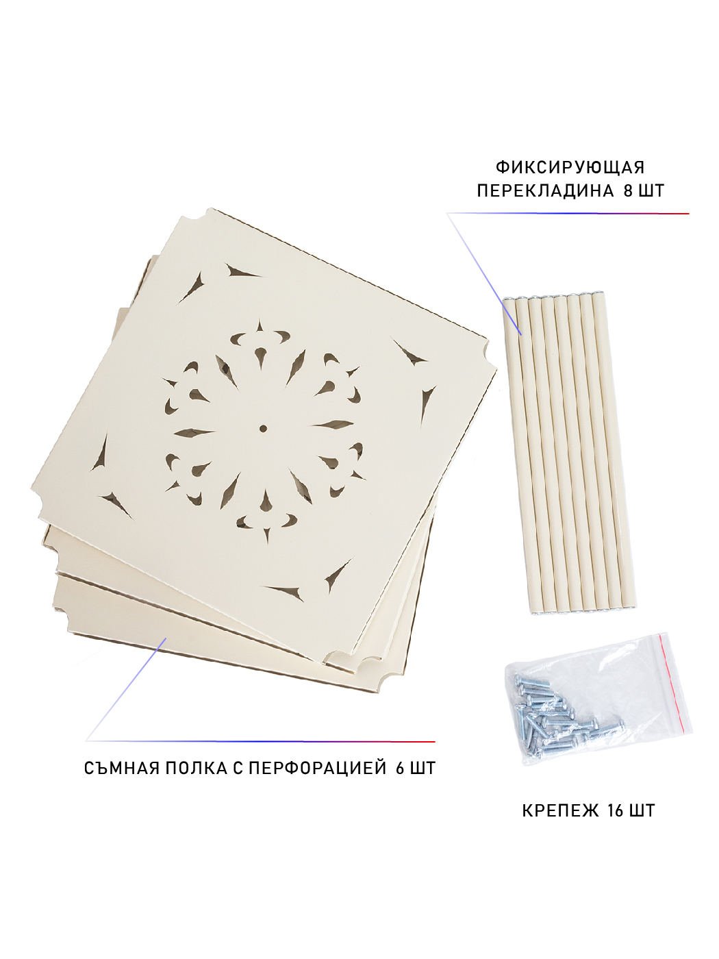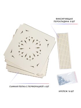 Комплектация: элемент стойки верхний задний – 1 шт., элемент стойки верхний передний – 1 шт., элемент стойки средний – 2 шт., элемент стойки нижний – 2 шт., перекладина фиксирующая – 8 шт., полка (или полка с перфорацией) – 6 шт., крепеж – 16 шт.