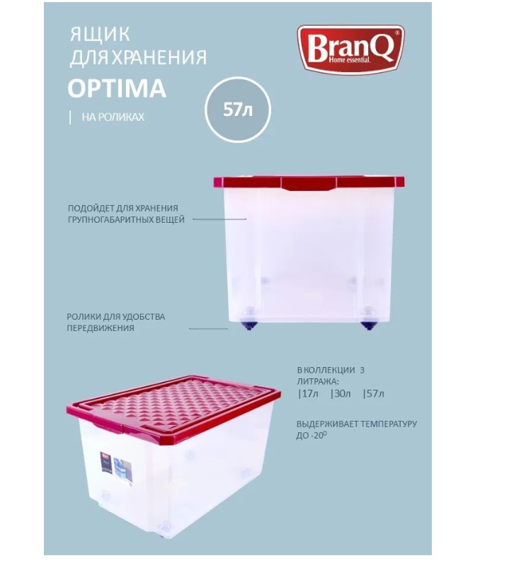 Это самый большой ящик в коллекции Optima, состоящей из 4 размеров (12, 17, 30 и 57 л), которые гармонично дополняют друг друга единым стилем и разными объемами