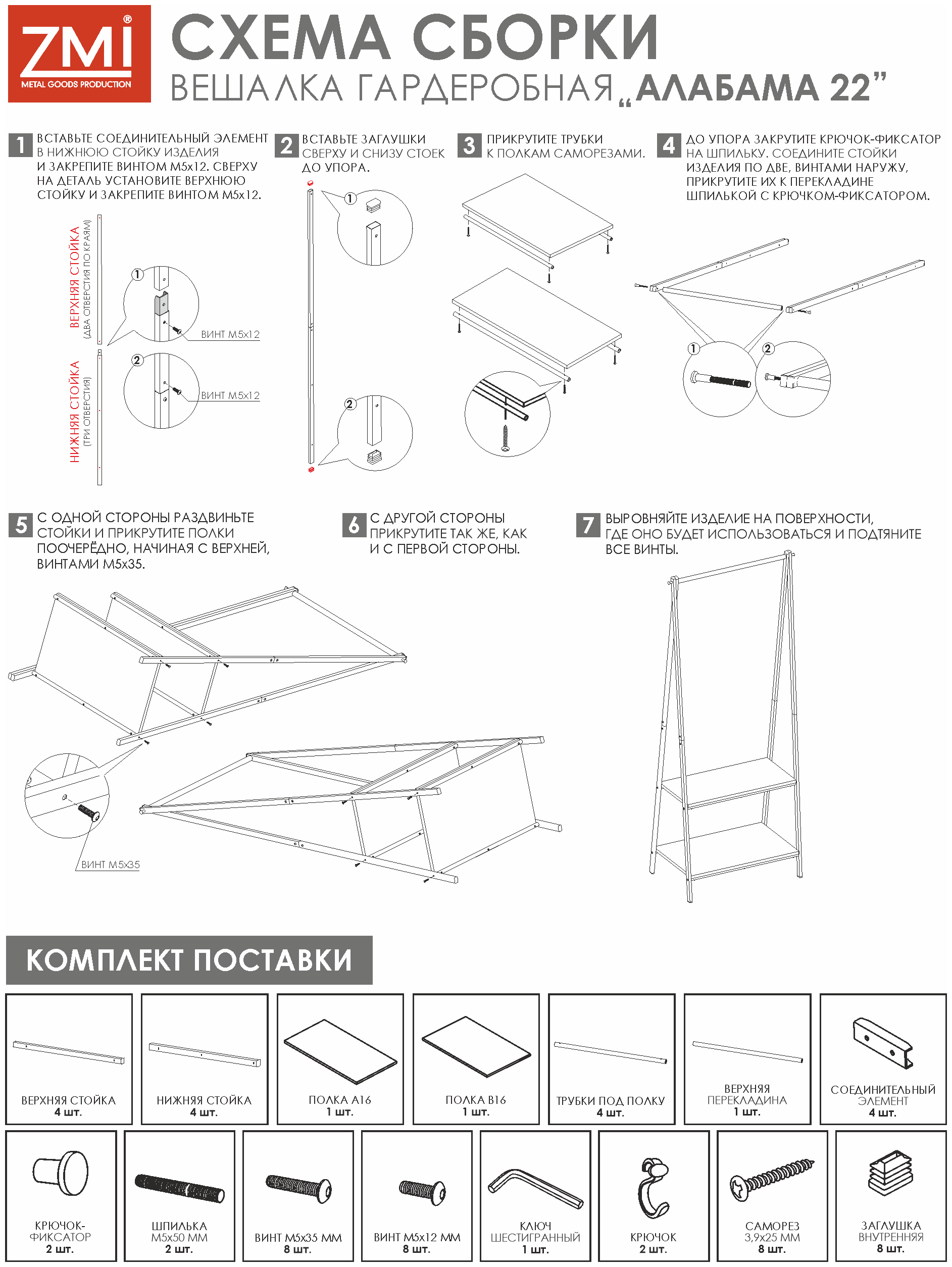 Конструкция вешалки разборная, собрать напольную вешалку легко в домашних условиях: для этого вам не потребуются специальные инструменты - хватит вашей отвертки и нашего шестигранника, который идет в комплекте.