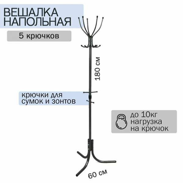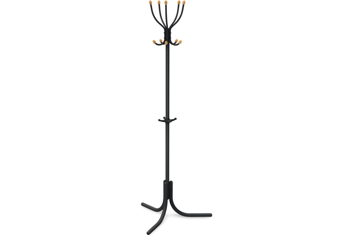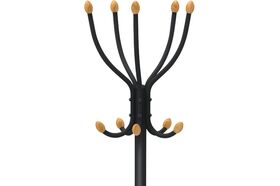 Классическая напольная вешалка с декором из дерева предназначена для размещения одежды и аксессуаров. Надежная металлическая конструкция выдерживает значительную нагрузку. Для комфортного использования предусмотренны дополнительные крючки для сумок и зонтов.