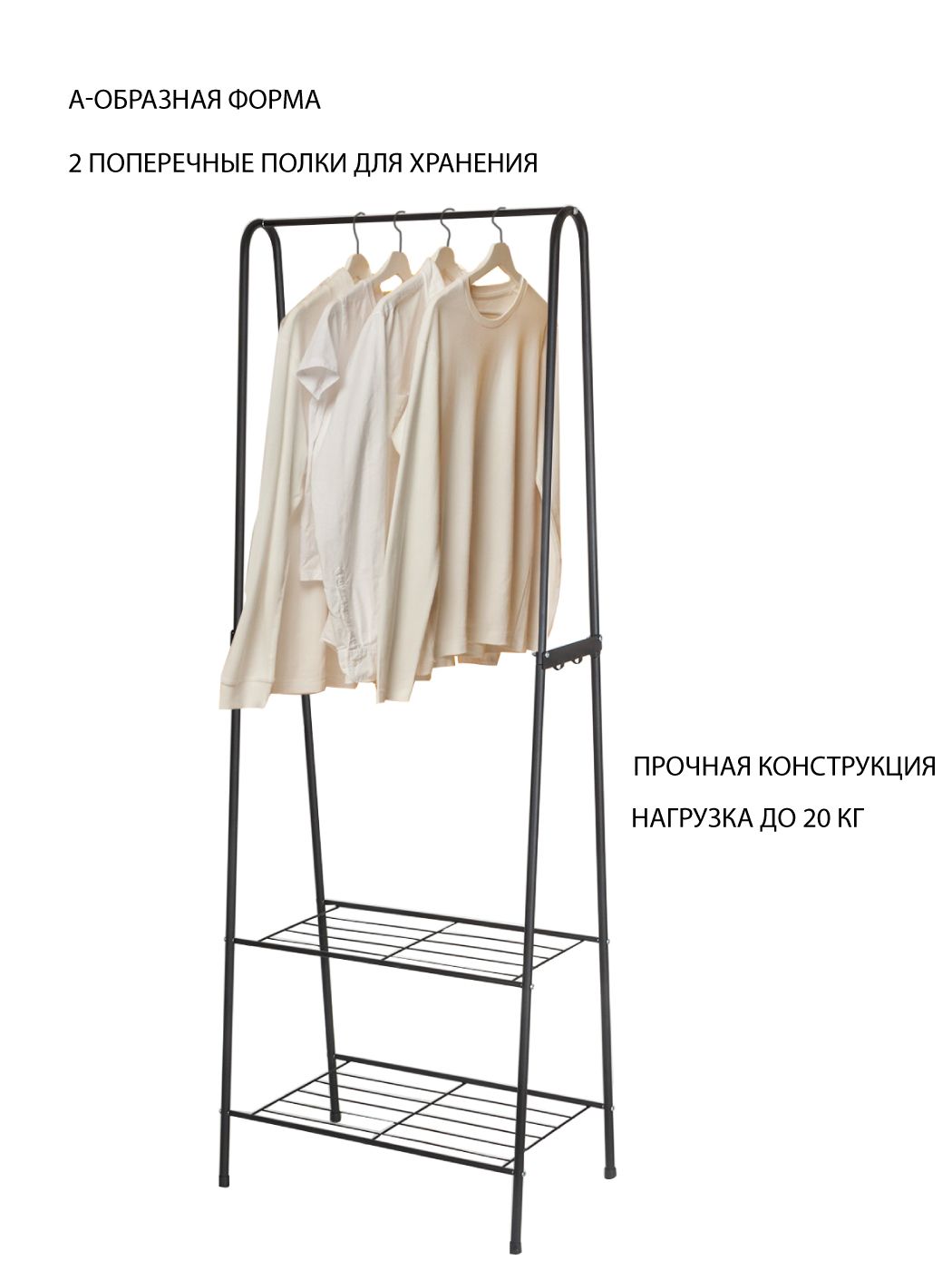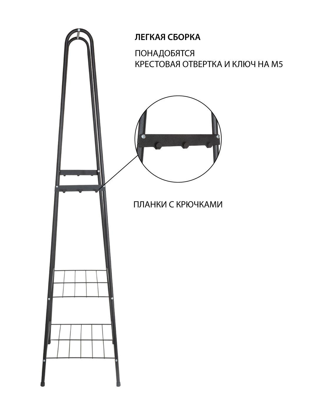 Вешалка напольная SupraKeeping предназначена для хранения вещей в прихожей, ванной, в кладовке или гараже. Конструкция сборная, мобильная, легкая в сборке. Вам понадобится крестовая отвертка, ключ на М5 и минимум времени, чтобы собрать вешалку. Простая А-образная форма с двумя поперечными полками и дополнительной планкой с крючками гарантирует устойчивость и эффективное использование пространства, позволяет хранить одежду, обувь, сумки, аксессуары и иные предметы. Рейл выдерживает до 20 кг. Практичная и функциональная металлическая вешалка SupraKeeping отлично впишется в любой интерьер квартиры или дома, а также может пригодится в фотостудии или салоне.