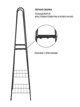 Комплектация: нижняя опора стойки – 4 шт., верхняя часть стойки – 2 шт., перекладина (рейл) – 1 шт., полка малая – 1 шт., полка нижняя – 1 шт., планка с крючками – 1 шт., винт 5х25 – 12 шт., винт 6х25 – 2 шт., шайба d5 – 4 шт., гайка М5 – 4 шт.
