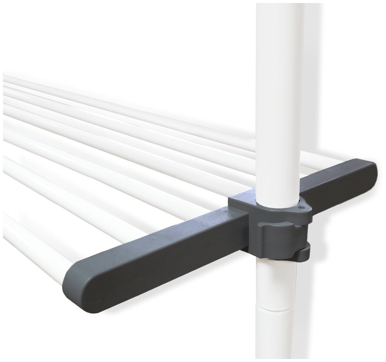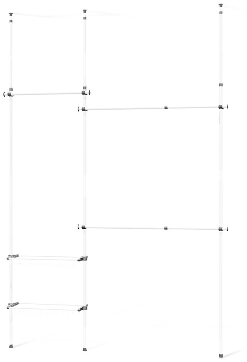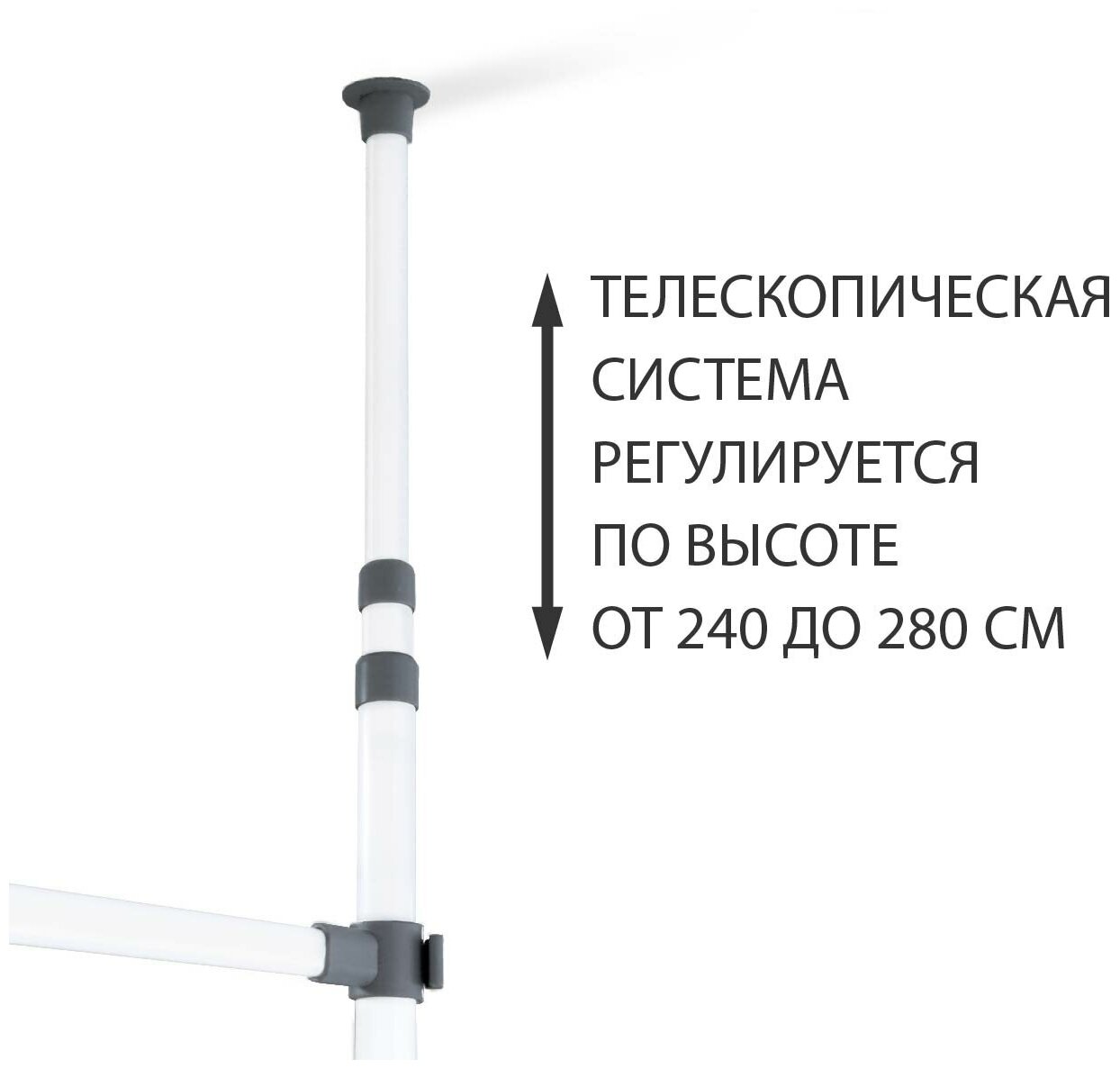 Система крепится между полом и потолком враспор. Основные вертикальные штанги телескопически регулируются по высоте от 240 до 280 см. Данная функция очень удобна при установке в нишу или комнату с индивидуальными размерами. Благодаря подвижным штангам возможен монтаж углом.