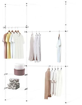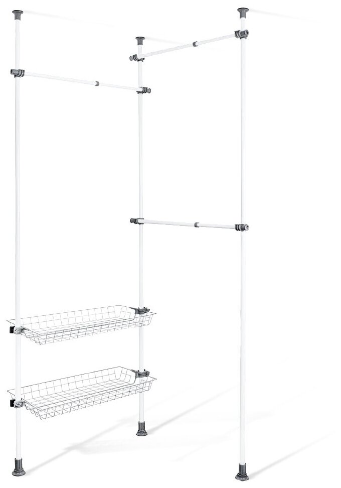 Мечта для любой гардеробной! Эта система предлагает достаточно места для платьев, пальто, пиджаков, брюк и рубашек. Две регулируемые по высоте корзины (размер каждой 80 на 27 см.). Три регулируемые по высоте штанги для подвешивания шириной 80 и 121 см.