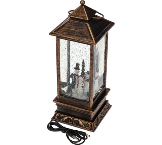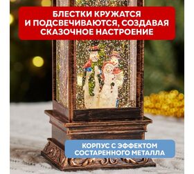 Оригинальное интерьерное украшение выполнено в бронзовом цвете, внутри колбы находятся фигурки ели и снеговиков. Вихрь серебристых блесток, подсвечиваемых диодами теплого оттенка, имитирует зимнюю вьюгу.