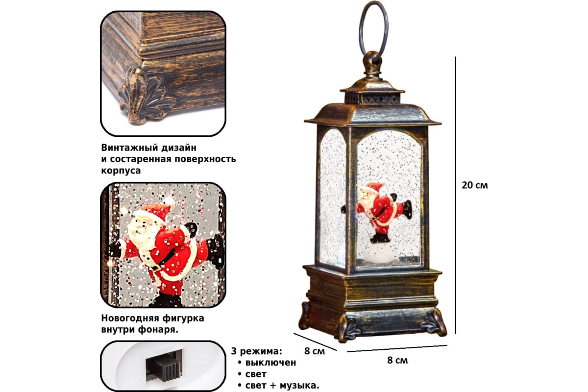 Имеет 2 рабочих режима: 1 - подсветка, механизм мерцания, кружится снег и начинают играть по очереди 8 мелодий; 2 -подсветка + механизм мерцания без музыки.