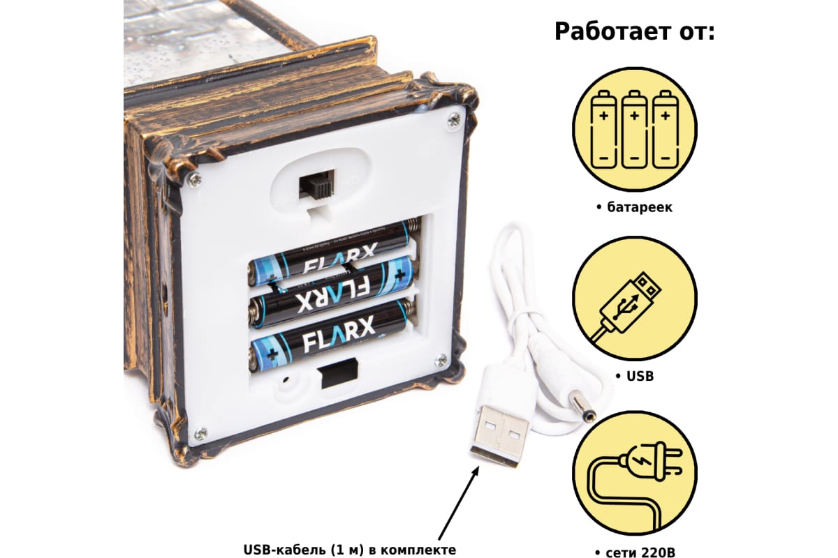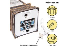 Работает фонарь от 3 пальчиковых батареек типа АА (в комплект не входят), USB шнура (входит в комплект) или сети 220 В (адаптер в комплект не входит).