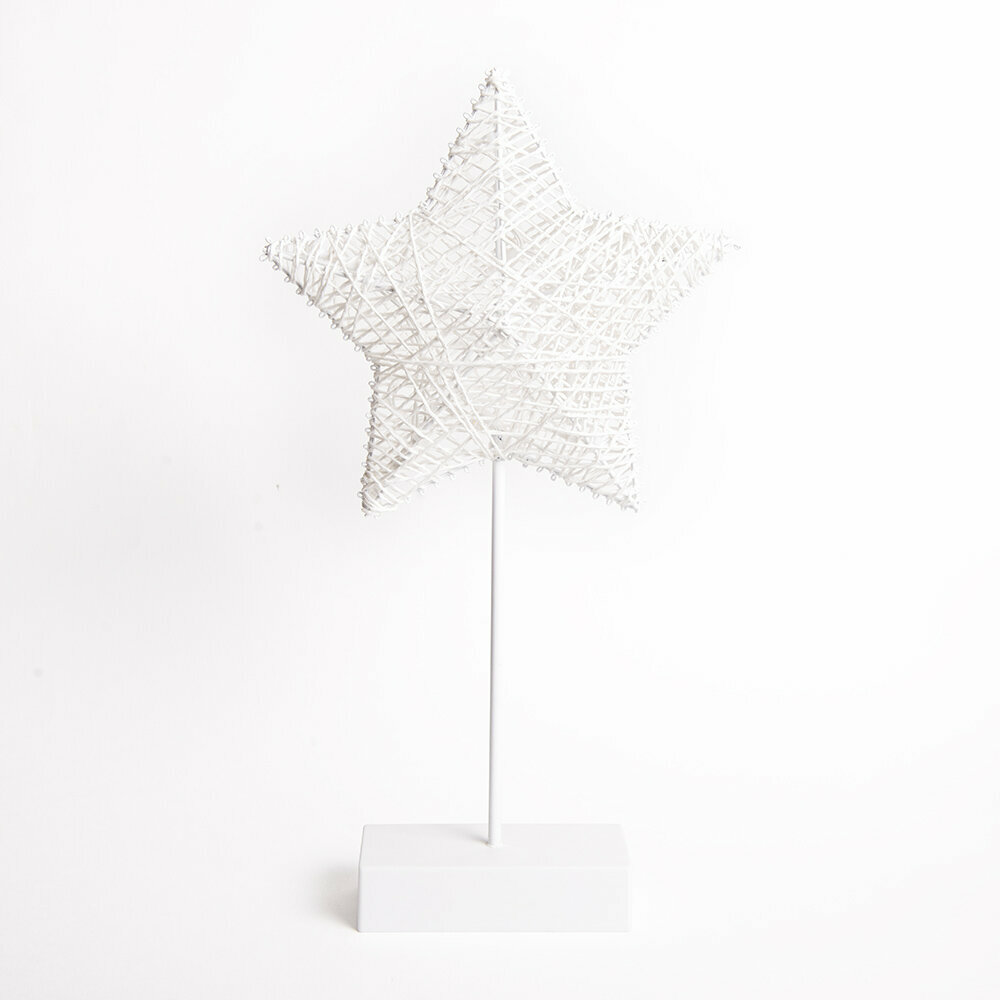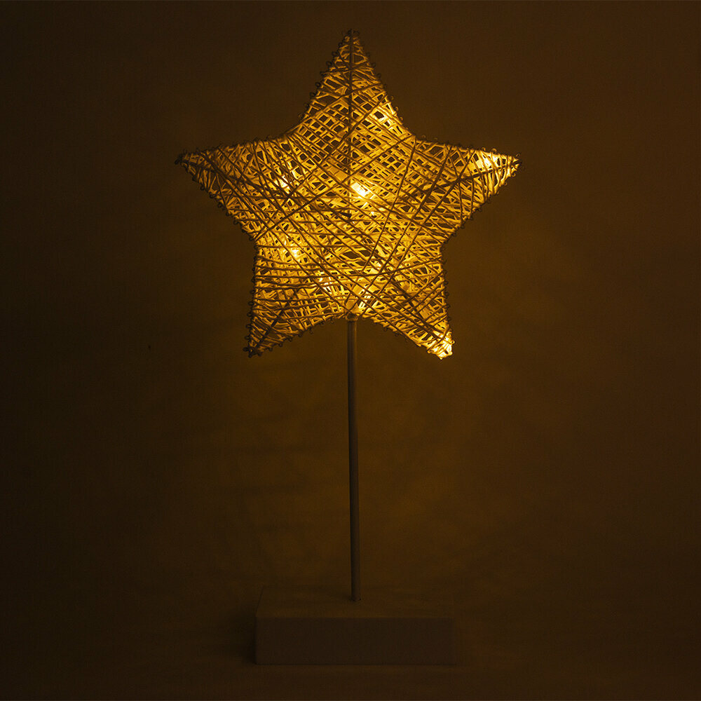 Светильник выполнен в форме звезды на подставке, сплетенной из нитей искусственного ротанга. Этот материал не только придает изделию уникальный и привлекательный вид, но и обеспечивает его долговечность и надежность.