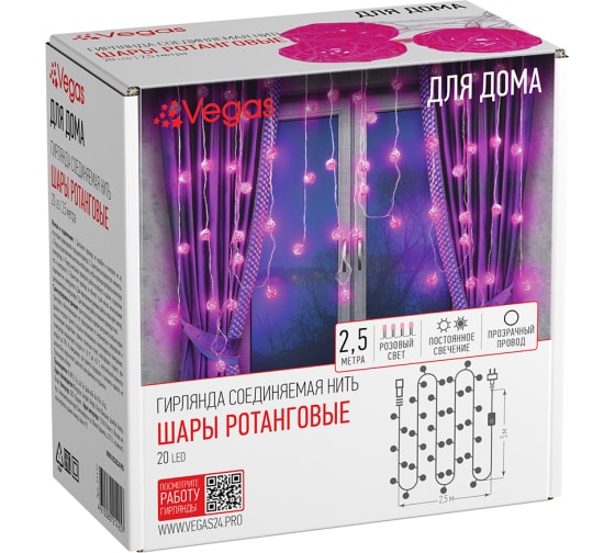 Электрогирлянда VEGAS Нить Шары ротанговые 2.5 м + 5 м шнур до питания 55177 предназначена для декорирования жилых и торговых помещений (елок, декоративных растений, ваз, картин и других предметов интерьера).