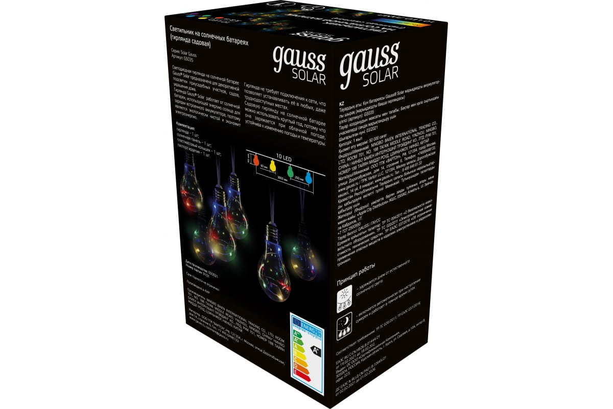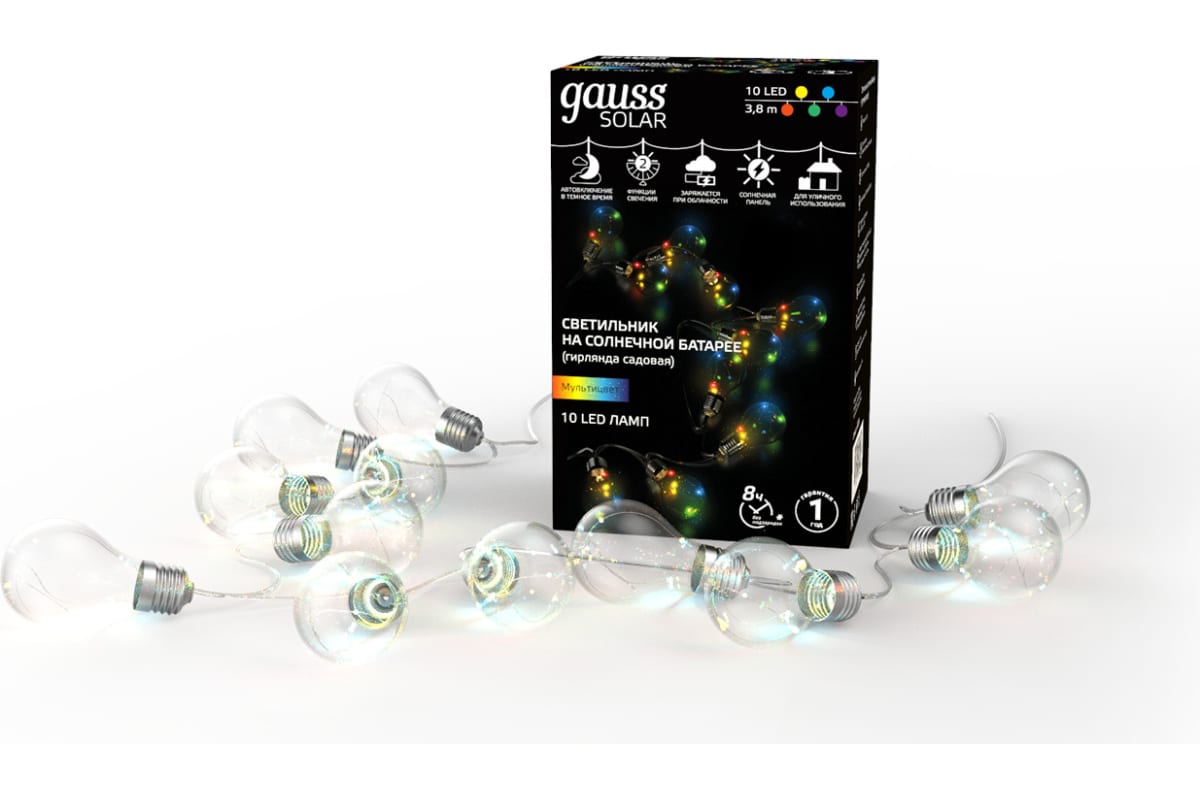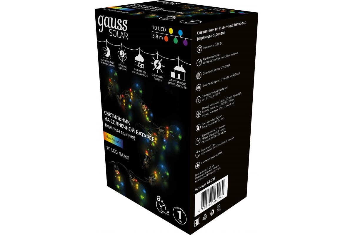 Садовая гирлянда на солнечной батарее Gauss Solar, 10 LED ламп, большие шары, мультицвет GS035 – это классическое декоративное освещение для дачных участков и открытых парковых территорий. Подойдет для подсветки между деревьями или фасада дома.