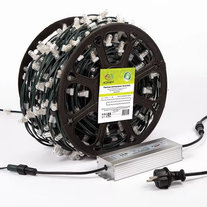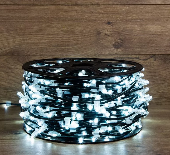 Данная гирлянда поставляется в бухтах по 100 м, представлена в белом цвете свечения светодиодов.
