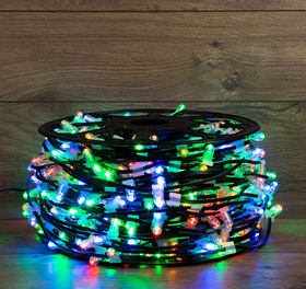 Данная гирлянда поставляется в бухтах по 100 м, представлена в цвете свечения светодиодов мультиколор.