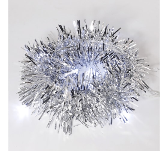 Светодиодная гирлянда NEON-NIGHT Мишура серебряная, 10LED, 1,5м белый свет свечения 2хАА 304-011 выполнена в виде привычной серебристой мишуры и дополнена 10 светодиодами, которые излучают ровный белый свет, питаясь от двух батареек типа АА.