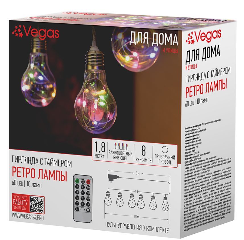 VEGAS 55133 Электрогирлянда "Ретро лампы" 60 разноцветных мигающих RGB LED ламп