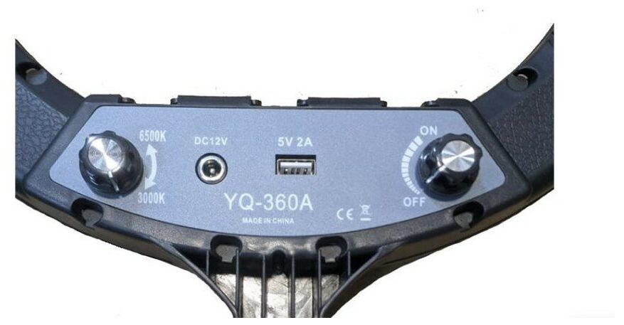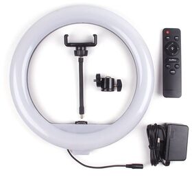 регулировка цветовой температуры, стойка в комплекте, регулировка яркости освещения, держатель для смартфона