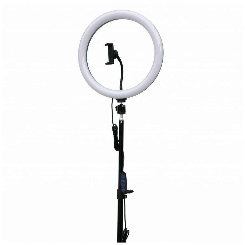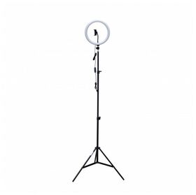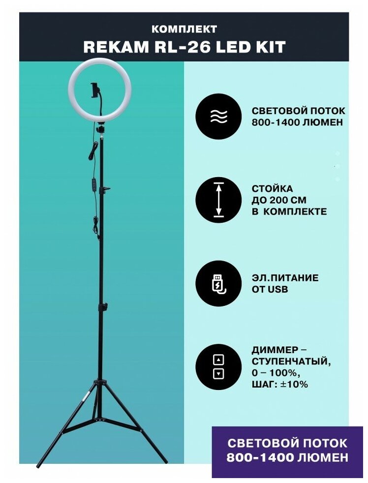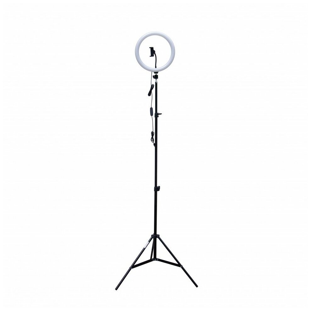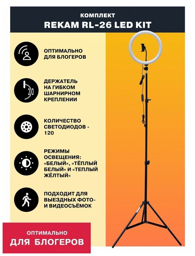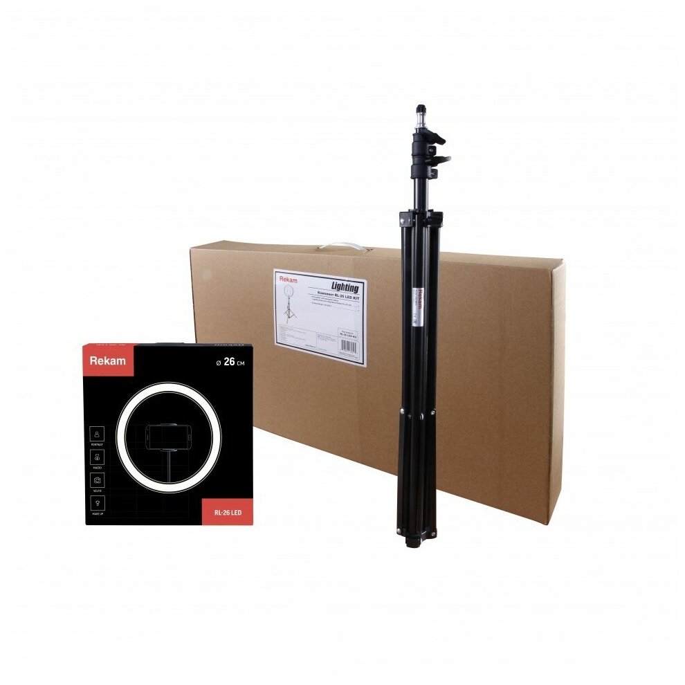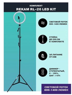 Кольцевая светодиодная лампа. Шнур питания с пультом и USB-разъёмом. Держатель для смартфона. Гибкое шарнирное крепление (Goose neck). Крепление на стойку (штатив) с интегрированной шаровой головой. Винт регулировки угла наклона лампы. Студийная стойка REKAM LS3?200?2 (75-200 см). Инструкция.